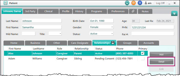 Select OK. The Patient Search window closes to the Relationships window with the Caregiver or Agent's information populated in the top section.