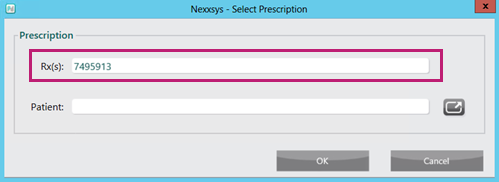 The Select Prescription window appears. - In the Rx(s) field, enter the prescription number(s) of the prescriptions that need to be refused.