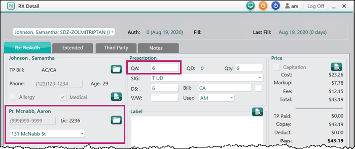 - QA - auto-populated based on the Qty of the previous fill. Pharmacists should use their discretion to determine if the QA should be changed.