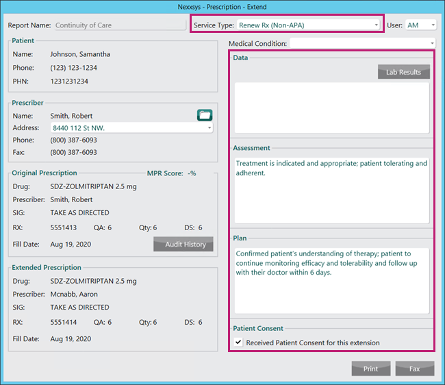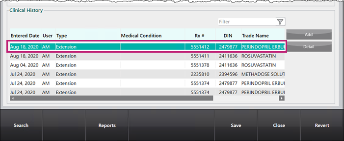 Note: Prescriptions that were extended prior to the Nexxsys 9.9 update (September 2020) will not have a Clinical History Note recorded. For these prescriptions, a note can be found in the History tab of the patient folder.