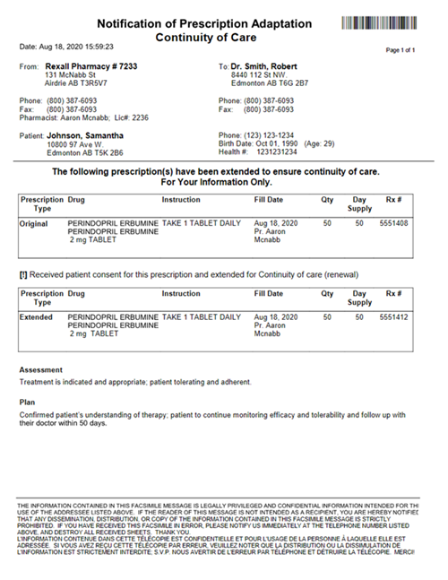 - Print - prints the Notification of Prescription Adaptation Form that must be manually faxed to the prescriber.