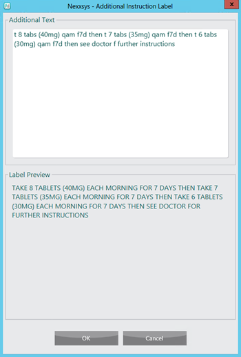 The Additional Instruction Label window appears. - Enter the dispensing direction in the Additional Text field, in regular text or using SIG codes. The label text will automatically preview in the box below.