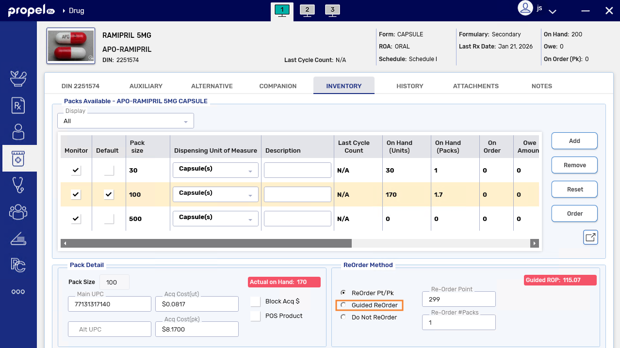 Once Guided Reordering is enabled at the pharmacy level, it can be set up for a product (pack size) in the Drug Folder. When this order method is chosen, you specify how much dispense history you want to consider for the calculation as well as the amount of stock you want to keep on your shelves. Propel Rx then calculates the Guided Reorder Point (Guided ROP) and order quantity for automatic reordering. For more information about the calculation, see Guided Reorder Point Calculation.