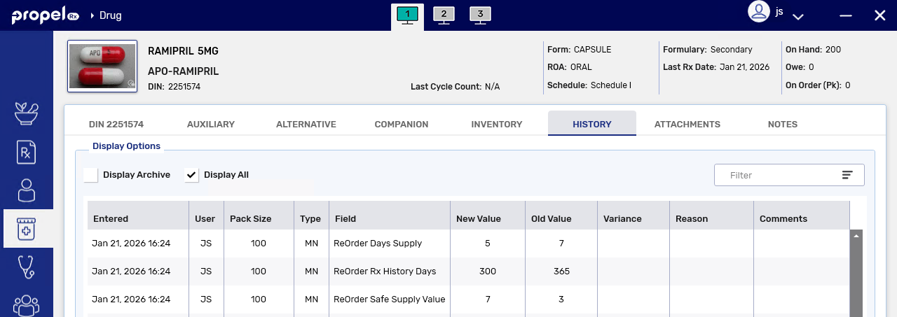 A row is added to the Drug Folder History tab to track changes to the order method, Days Supply, Rx History, and Safe Supply fields.