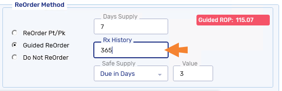 In the Rx History field, enter the number of days worth of dispensing history that should be considered in the Guided ROP calculation (between 30 and 365). Only prescriptions with a Complete or Amend status are considered.