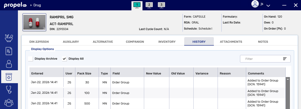 • Additions to the Order Group are recorded in the Drug Folder History tab of the drug that was added.