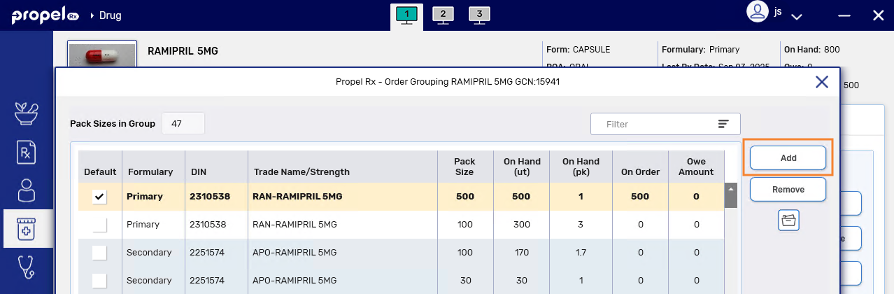 • If you don't follow a banner formulary, the Default is the DIN with the highest On Hand value and its default pack size. If the On Hand values are the same, the DIN with a ReOrder Point set is used.