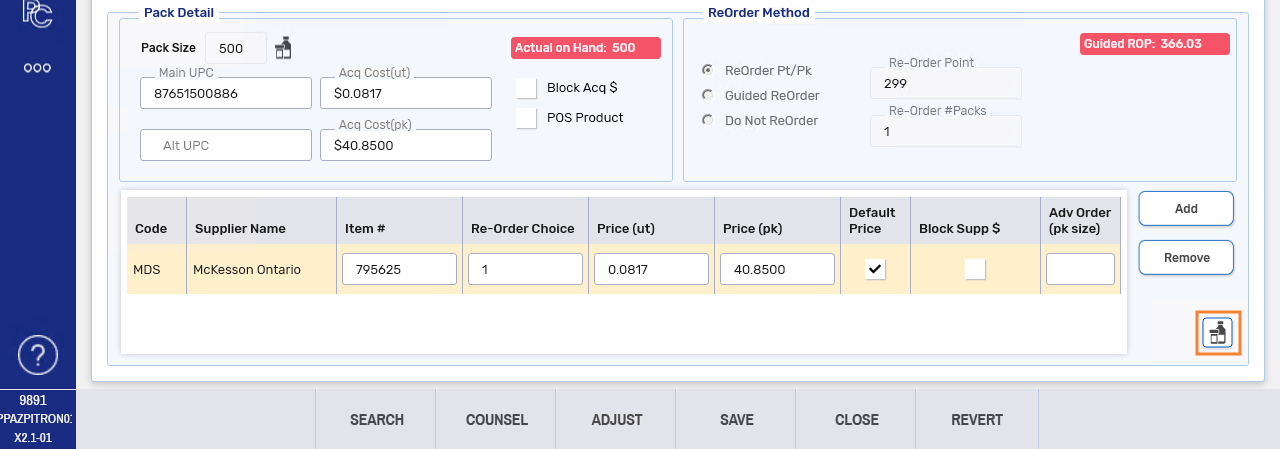 • If the Group Reorder Method is set to Guided Reordering, the Guided Reorder Point (Guided ROP) is recalculated based on the pack size(s) added. Changes to the Guided ROP are recorded in the Drug Folder History tab.