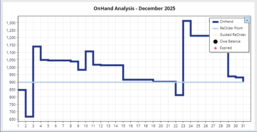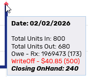 • OnHand - the On Hand value starting from the closing inventory of the previous day. Downstrokes correspond to dispenses and negative manual adjustments. Upstrokes correspond to shipments received, positive manual adjustments, and cancelled prescriptions.
