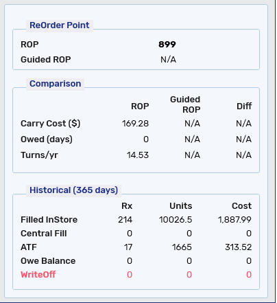 • Guided ReOrder - the calculated Guided Reorder Point for the pack size. For more information, see Guided Reordering.