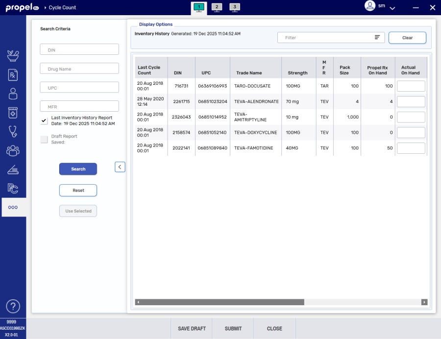 The Cycle Count module assists with easily and efficiently reconciling the Actual on Hand values with the values that Propel Rx has recorded for multiple medications at one time.