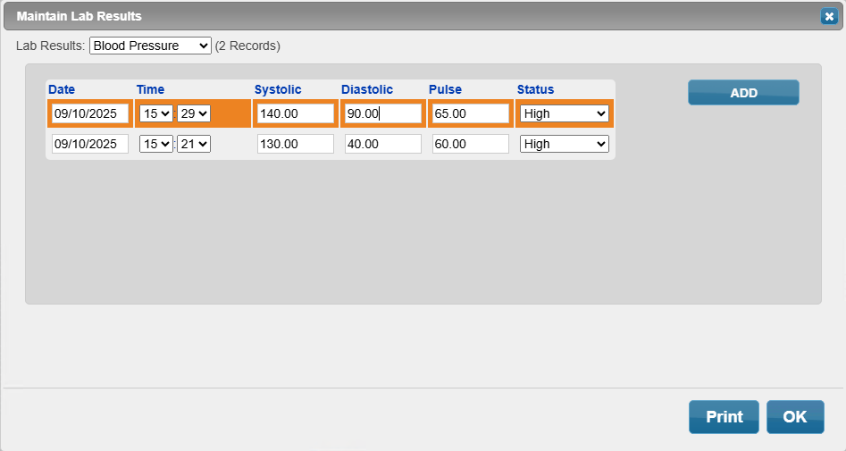 Patient lab results can be recorded using the Lab Results button. When added or updated in Patient Centre, the information is updated in the Patient Folder Clinical tab.