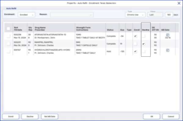 Under the Decline column, select the checkbox for the prescription(s) that are being removed from the program.
