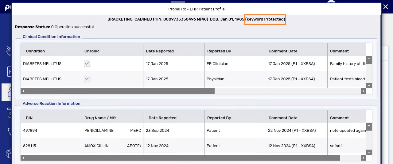 If information on the EHR was accessed using a keyword, the phrase, “Keyword Protected” will display in the window.