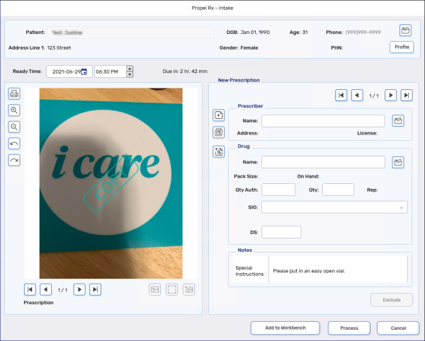 When a PhotoRx prescription is opened in the Intake window, the photo of the prescription attached displays on the left side of the window.