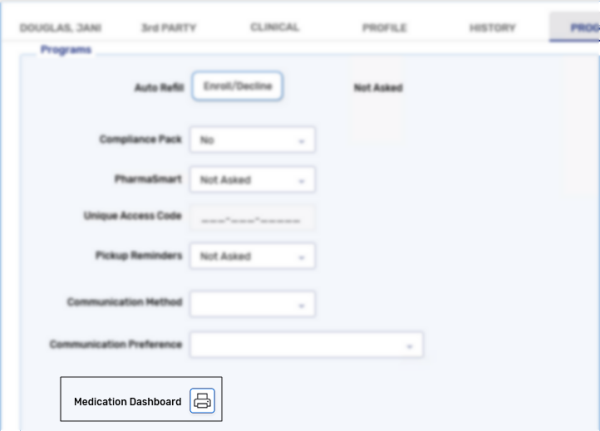 The Medication Dashboard can be manually printed from the Programs tab by selecting the printer icon next to Medication Dashboard.