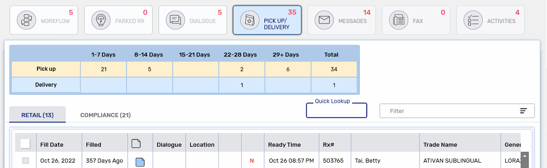 The Pick Up/Delivery tile displays a red N next to prescriptions that have not been acknowledged by the NMS. Action must be taken by your pharmacy to resolve the issue. It is important to note that these prescriptions have already been adjudicated financially; it is the NMS transaction that remains outstanding. NMS provides a 365 day window in which to submit the outstanding transactions.