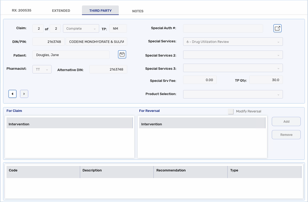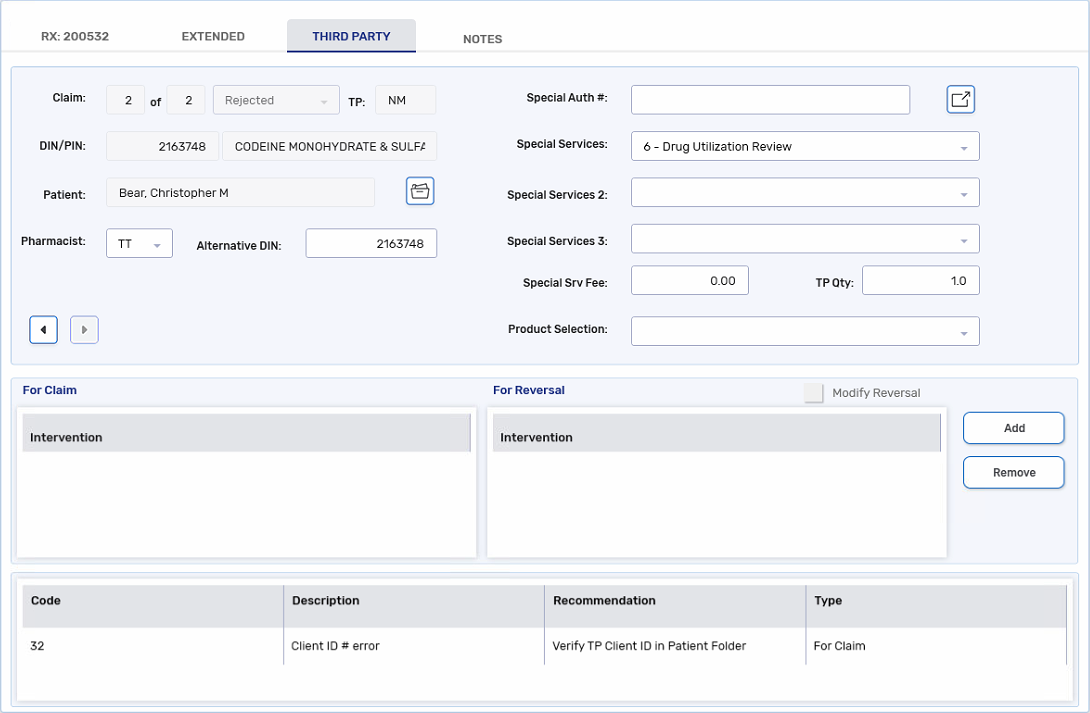 The NM claim in the Rx Detail Third Party tab indicates whether the claim has been adjudicated successfully. As with all Third Party adjudication, the claim status indicates if the submission is Complete, Rejected, Failed, Reversal Rejected, Reversal Failed, or Cancelled.