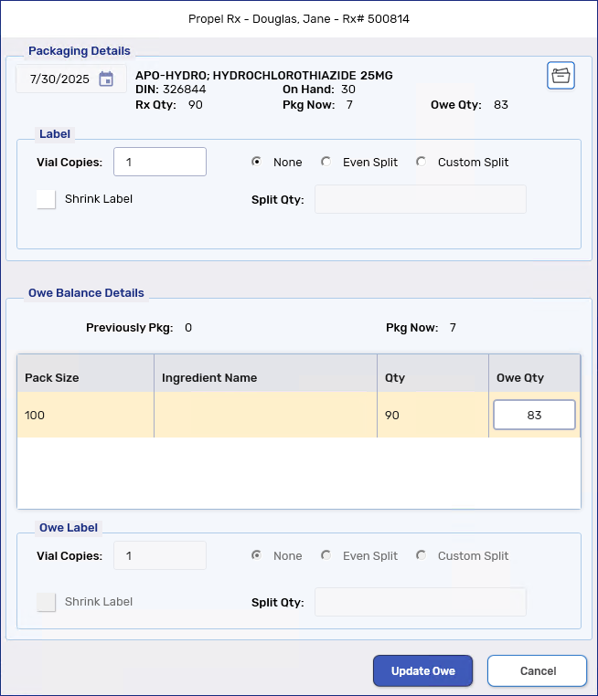 The Owe Balance Days Supply setting is used to calculate the default Owe Qty that auto-populates in this window. Modify this setting if needed to reflect the days supply your pharmacy usually gives for an initial fill.