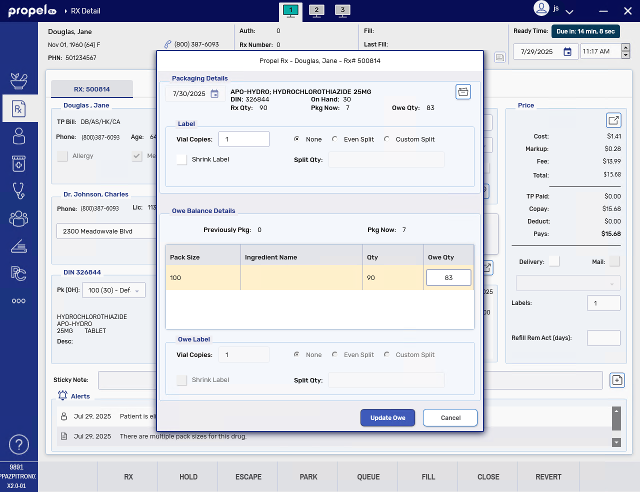 2. The Owe Balance window opens automatically in Rx Detail. In the Owe Balance Details section, update the Owe Qty if needed.