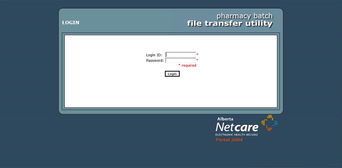 Select Log In. If the login was successful, the pharmacy Batch file transfer utility login window will load. This is the second level in the two-level login where only users with Alberta Netcare Batch permissions can log in.