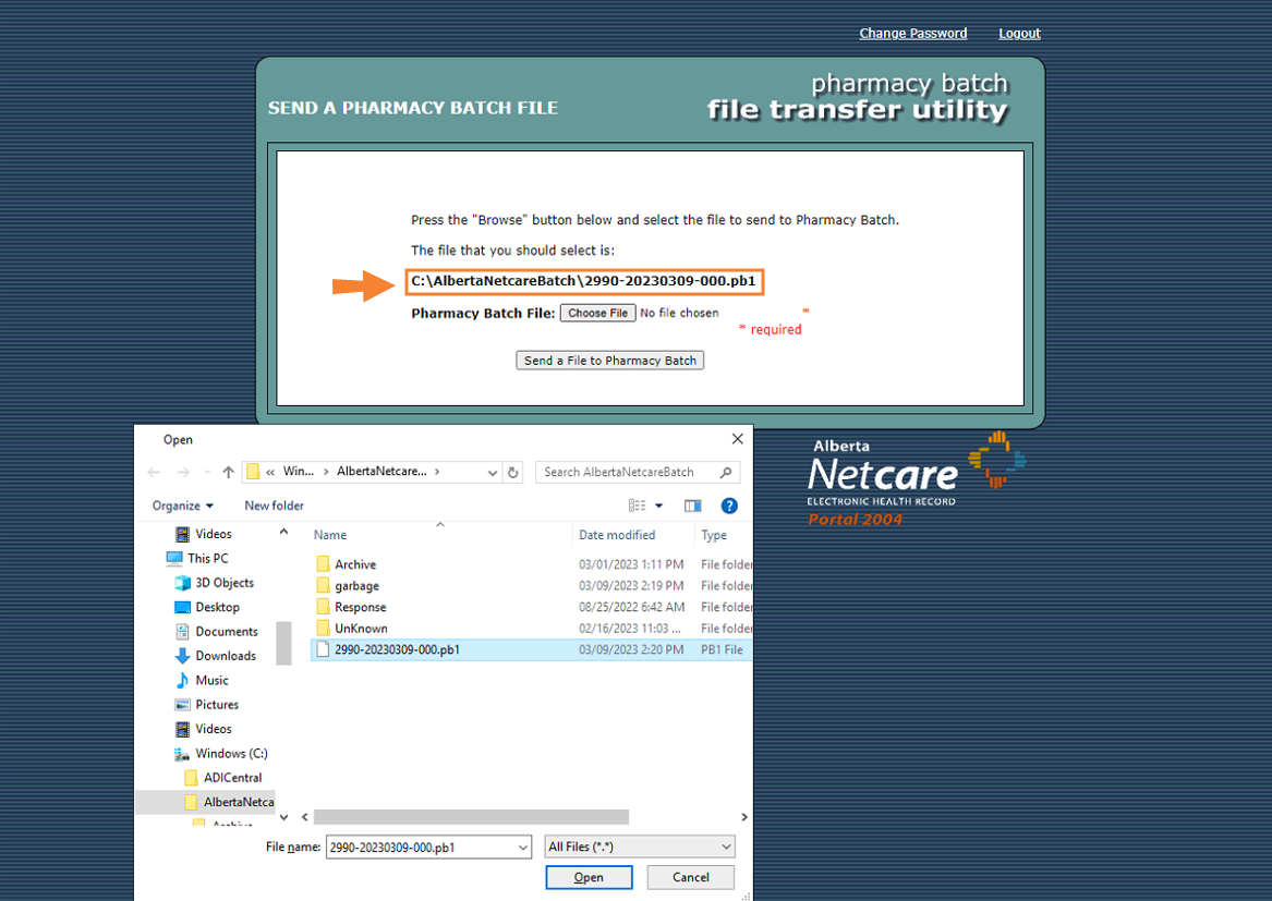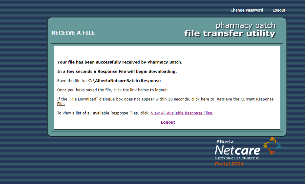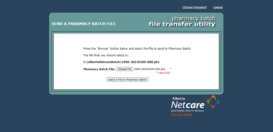 Select the Send a File to Pharmacy Batch button. There will be a brief delay before the next window loads while the file is transmitted to Alberta Netcare.
