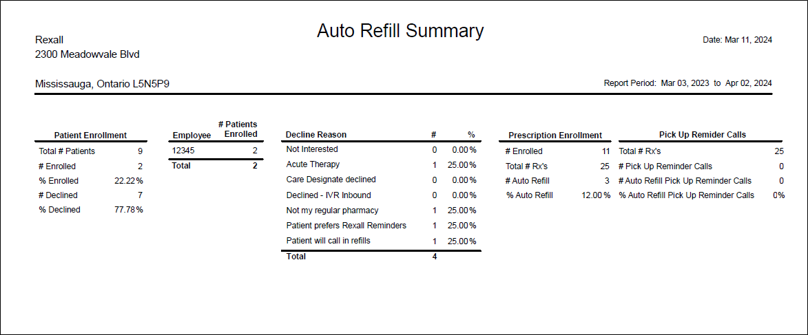 The Auto Refill Summary report provides statistics for all patients and prescriptions enrolled in the Auto Refill service within a specific time period, as well as the number of Pick Up Reminder calls generated for Auto Refill prescriptions.