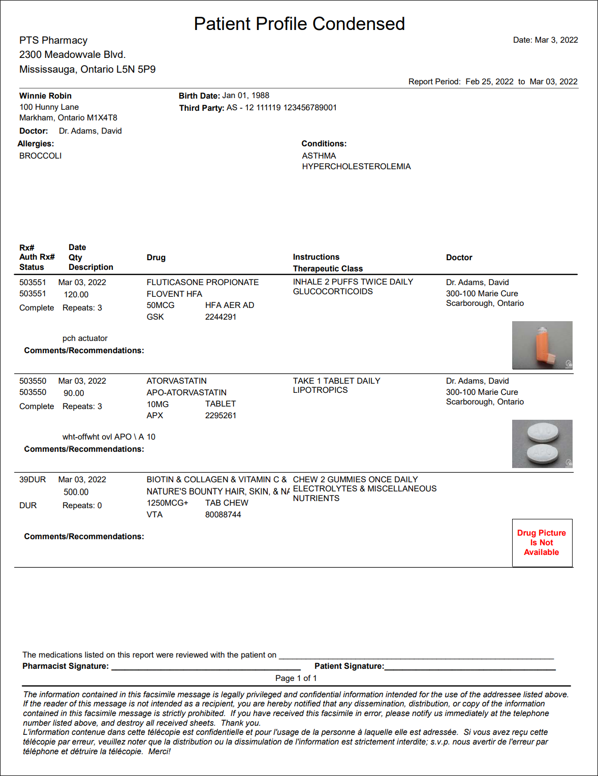 Include Drug Pictures - the report includes the drug pictures for each prescription. If there is no picture available in the Drug Folder, the following message appears: 'Drug Picture Not Available.' If there is no colour printer, the picture prints in black and white.