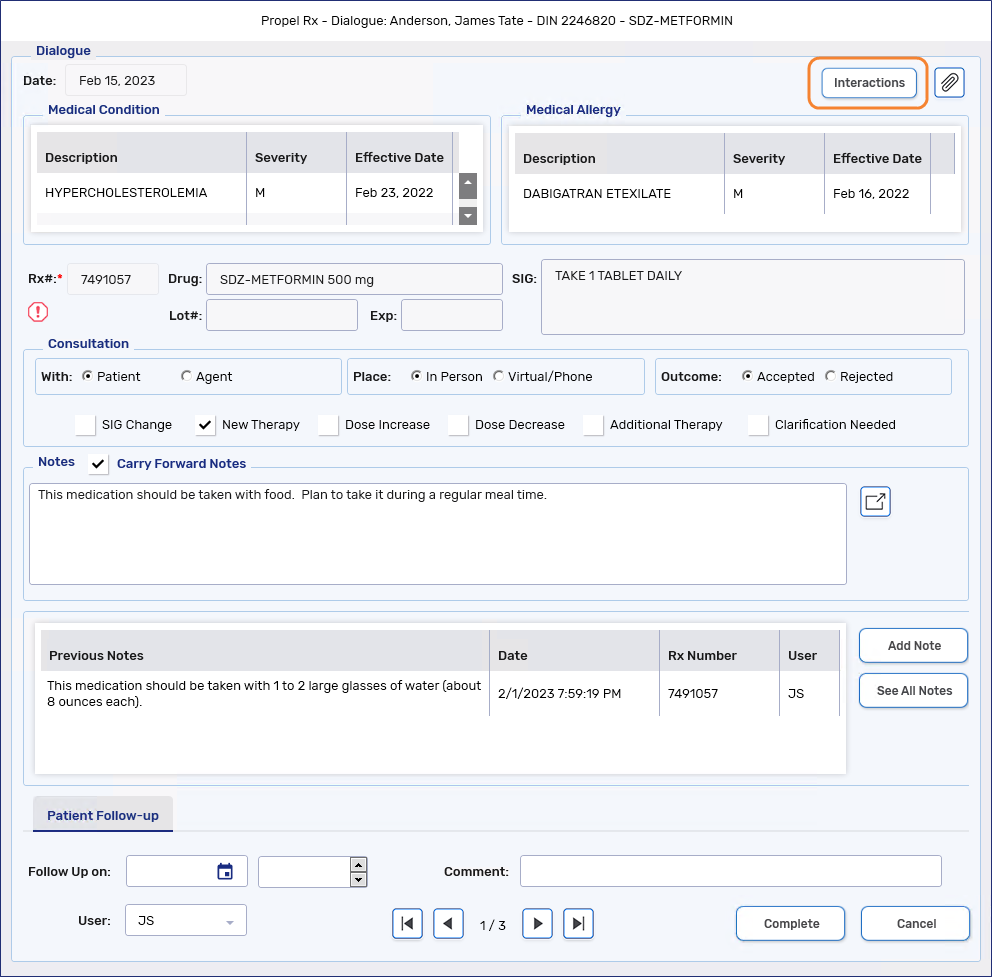 An Interactions button has been added to the Dialogue window. The purpose of this button is to access interaction details to guide patient counselling. When this button is selected, the Interaction Detail window opens and displays the information that appeared when processing the prescription in Rx Detail. From this window, the interactions can be printed using the Print button.