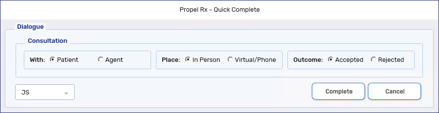 When one or more prescriptions are highlighted and Quick Complete is selected, the Quick Complete window opens. The window is a condensed version of the existing Dialogue window and contains the following fields: