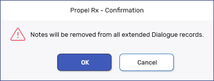 If the checkbox is turned OFF when previously ON and notes are entered, a prompt alerts the user that the notes from all Dialogue records except the first will be removed. Selecting OK to the prompt removes the notes as indicated and turns off the checkbox. Selecting Cancel to the prompt aborts the action, no notes are removed, and the checkbox remains ON.