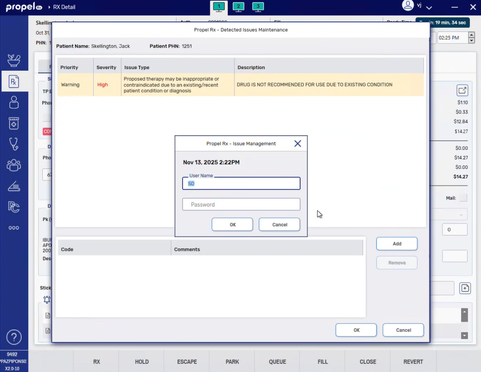 Issue management can now be entered when a non-pharmacist user is logged in. When a non-pharmacist selects Add in the Detected Issues Maintenance window, a login prompt appears for a pharmacist to enter their credentials or fingerprint (if a reader is enabled). The pharmacist does not need to be linked to the current user. Once valid credentials are provided, the Issue Management section becomes active for the pharmacist to complete. This enhancement allows pharmacists to manage an issue at the time of fill, optimizing workflow.