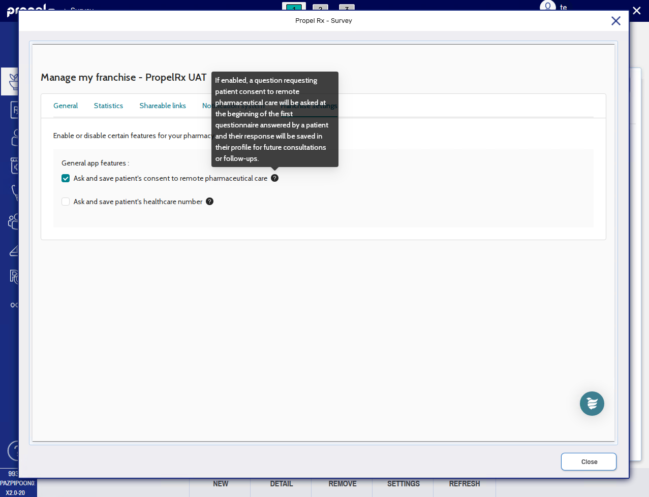 Ask and save patient's consent to remote pharmaceutical care - if enabled, the patient is asked to provide consent on their first survey. Consent is stored in the survey site for the patient's future surveys.