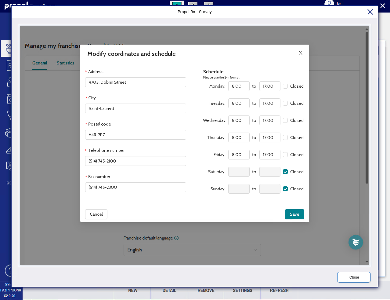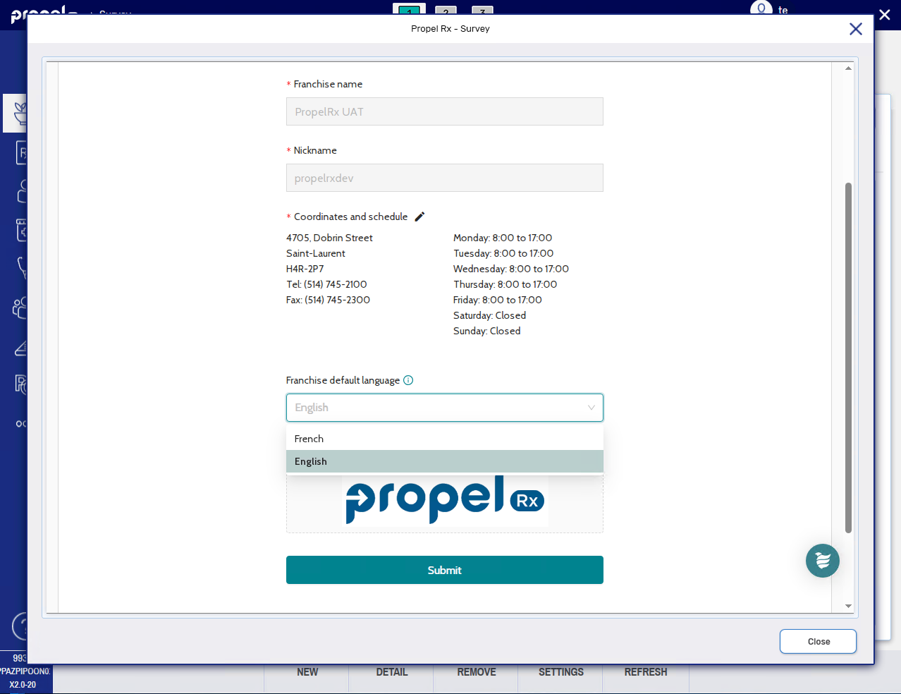The General tab contains general information about your pharmacy that prints on forms and other documents sent to the patient. This includes pharmacy name, contact information, hours, default language, and logo. From this tab, you can edit the contact information for your pharmacy and default language. Any changes to your pharmacy's general information are saved on the survey site only; they do not write back to Propel Rx.
