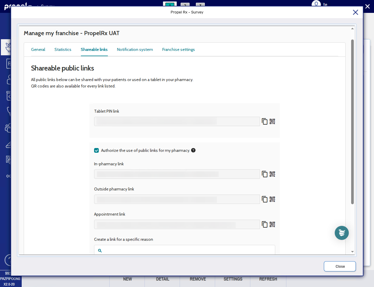 The Shareable links tab contains links and QR codes for consultation surveys that can be displayed physically in your pharmacy, shared online, or entered on your pharmacy's iPad. The links will open a public page associated to your pharmacy.