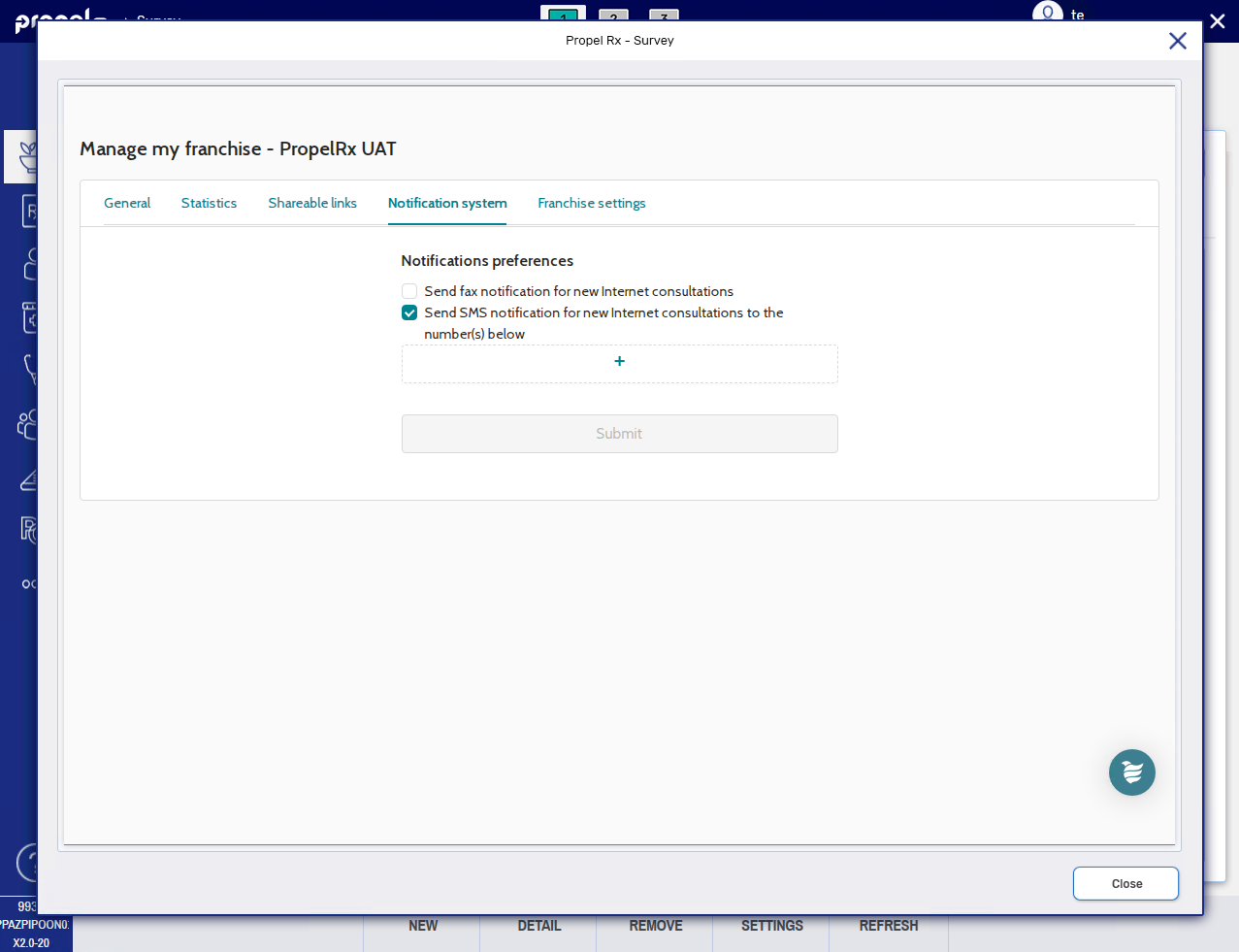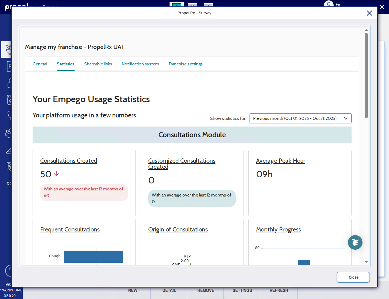 Within Propel Rx, you can access and configure survey settings including pharmacy contact information, logos that print on patient facing documentation, shareable links, and more. You can also review statistics on the number of consultations or follow-ups completed using the Surveys module.