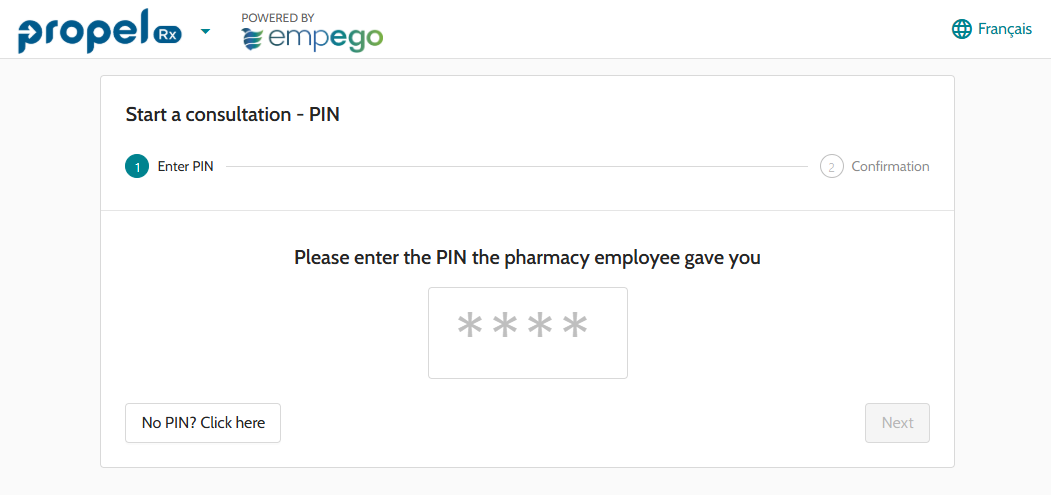 A tablet PIN link can be entered on your pharmacy's iPad. When the link is opened, a page displays for patients to enter a 4-digit PIN associated to their survey. PINs can be generated when sending a consultation survey.
