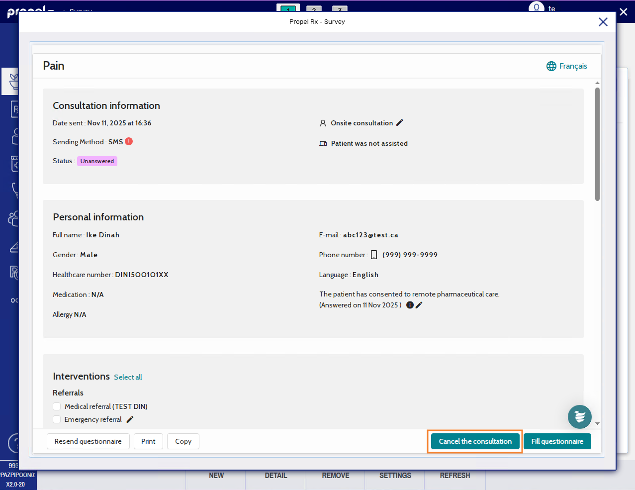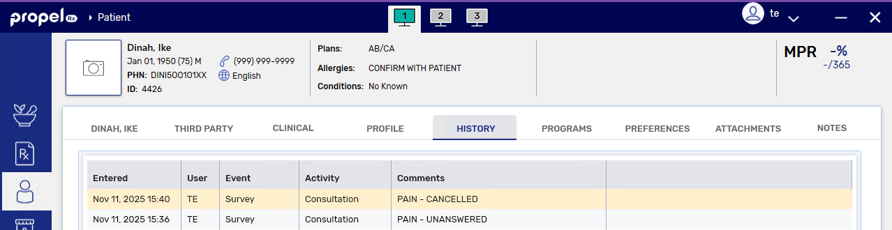 Surveys sent from Propel Rx can be cancelled if they have not been answered by the patient yet (i.e., Status = Send or To Be Answered). Cancelling a survey will not retract an email or text message that was already sent to the patient but it will break the survey link so the patient can't access the survey. This can be done when the survey was sent in error or the consultation or follow-up is no longer required. If a survey has not been answered by a patient within 14 days (for consultations) or 30 days (for follow-ups) of sending, the survey is automatically removed on the survey site and cancelled in Propel Rx. Survey cancellations, whether manual or automatic, are recorded in the Patient Folder History tab for tracking purposes.