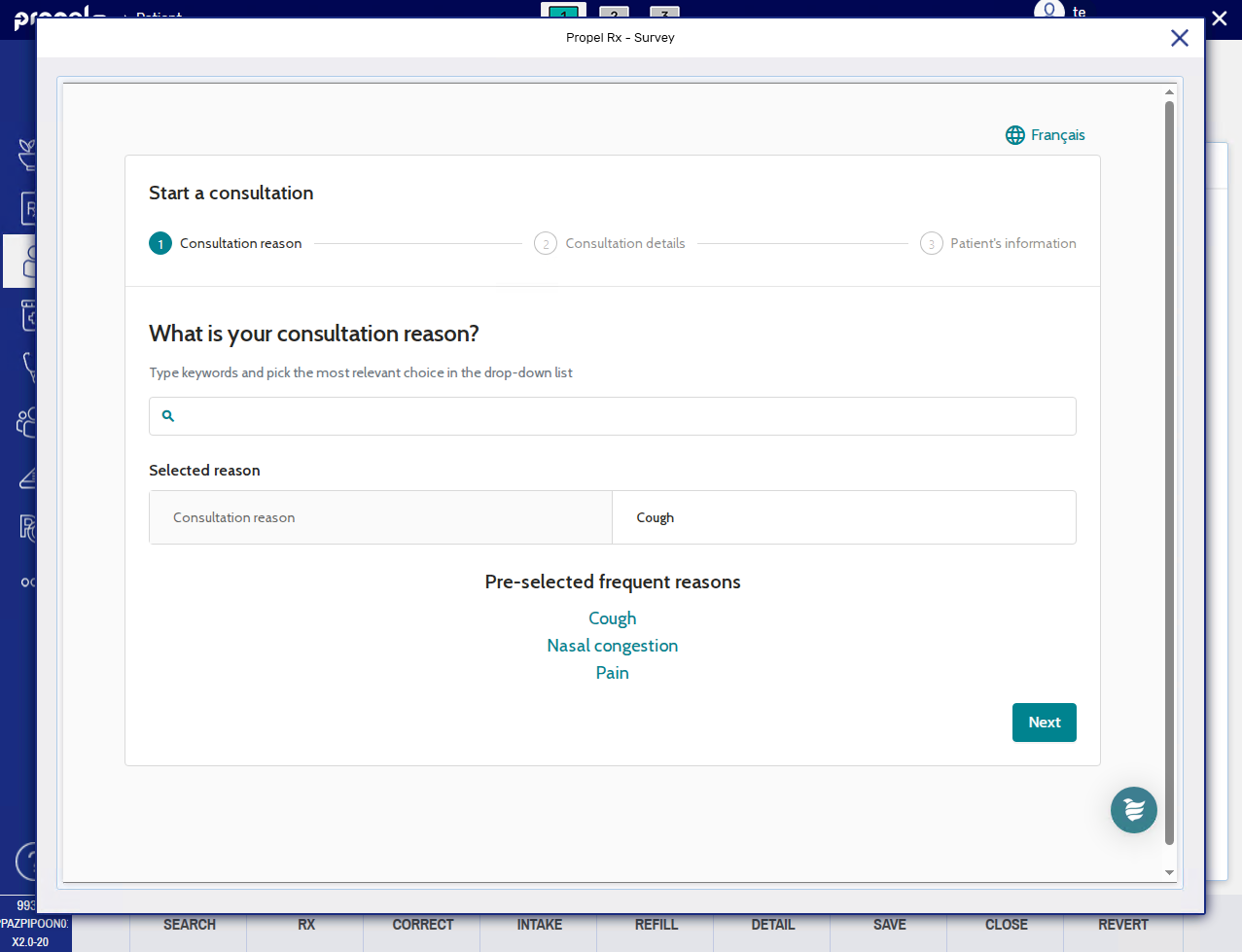 The Survey window opens. Enter the consultation reason in the given field and select the appropriate choice from the dropdown menu. Once done, select Next.