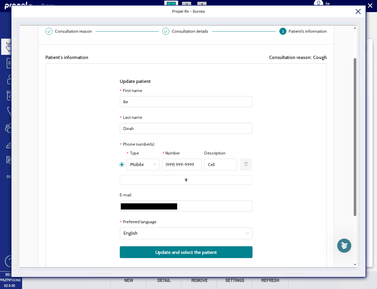 If any information is missing or not accurate, select Modify patient's profile, make any necessary edits, and then select Update and select the patient. Any changes made will be saved on the survey site but not write back to Propel Rx.